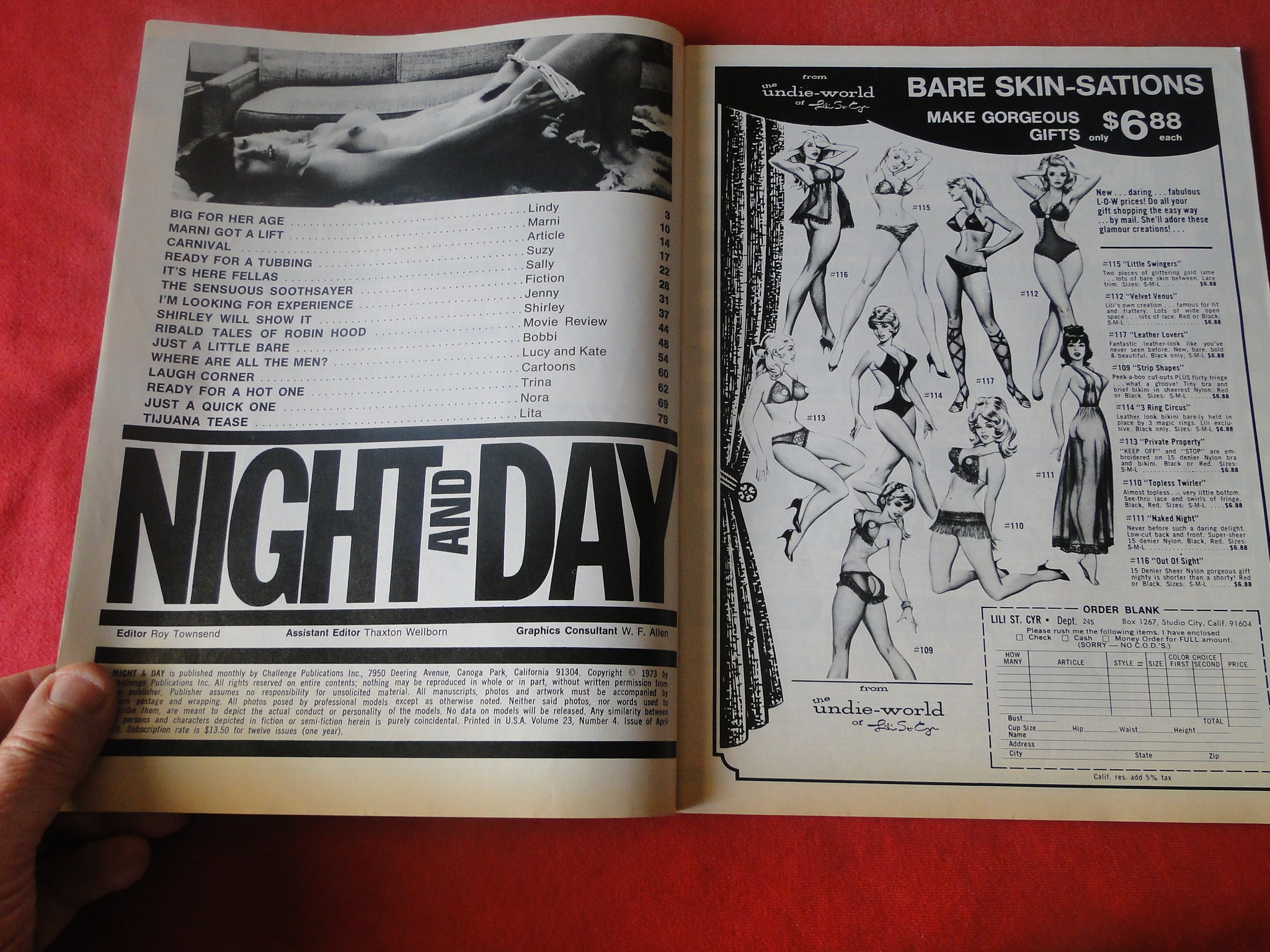 Vintage Nude Erotic Sexy Adult Magazine Night and Day April 1973 P6 You will receive the magazine in the pictures. Please use the pictures to guide your bidding decisions. Please see our other auctions for vintage adult magazines. Please see our other auctions for vintage adult material. Please see our other auctions for rare, unusual, and hard to find items. We will be listing a huge amount of adult material over the coming weeks and months. Please put us on your favorites list. We do combine shipping on multiple purchases. Please wait for an invoice before paying.