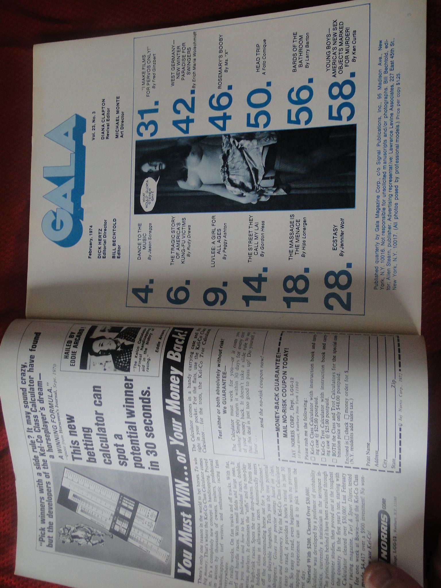 Vintage Nude Erotic Sexy Adult Magazine Gala February 1974 JB54 You will receive the magazine in the pictures. Please use the pictures to guide your bidding decisions. Please see our other auctions for vintage adult magazines. Please see our other auctions for vintage adult material. Please see our other auctions for rare, unusual, and hard to find items. We will be listing a huge amount of adult material over the coming weeks and months. Please put us on your favorites list. We do combine shipping on multiple purchases.