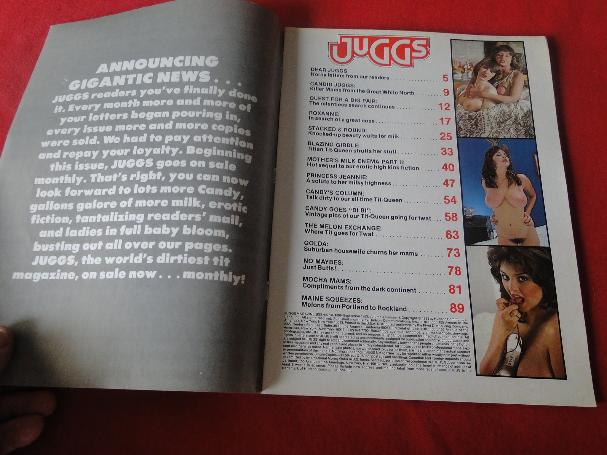 Vintage Nude Erotic Sexy Adult Magazine Juggs September 1983 P89 You will receive the magazine in the pictures. Please use the pictures to guide your bidding decisions. Please see our other auctions for vintage adult magazines. Please see our other auctions for vintage adult material. Please see our other auctions for rare, unusual, and hard to find items. We will be listing a huge amount of adult material over the coming weeks and months. Please put us on your favorites list. We do combine shipping on multiple purchases. Please wait for an invoice before paying.